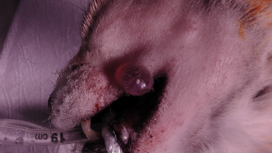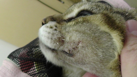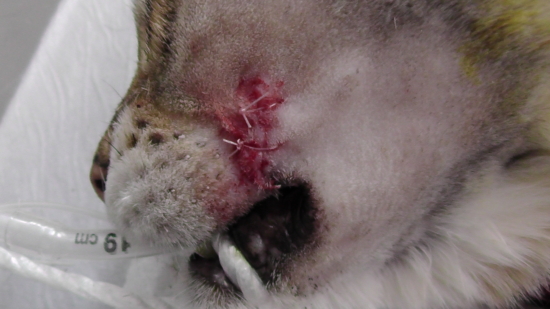 今日は皮膚と口腔の境界にできた腫瘤です。猫では、あまり発生の認められないイメージですのでレポートしました。腫瘤は皮膚に出来ているのですが、切除するには皮膚とともに裏の口腔粘膜も一緒に切除します。これは、眼瞼縁に出来た腫瘤切除と同じ理屈ですね。 他に皮膚と粘膜の接合部で口唇や口集の皮膚が罹患する感染症で粘膜皮膚膿皮症などが知られていますね。