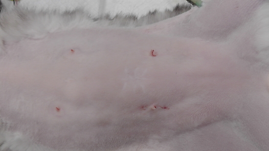 先日、「ねこを保護したので避妊手術をしてほしい。」と依頼がありました。定法通り、手術前に血液検査やレントゲン検査を行い異常を認めないため、麻酔を施しました。気管チューブを挿管して、剃毛しました。剃毛後に下腹部に以前メスで切った切開痕がありました。これは恐らく、以前に避妊手術が行われた可能性が高いため、飼主にその旨を伝えて手術を止めたことがあります。その猫の耳にはV字カットもないためわかりませんでした。この様なケースもありますので、より慎重に確認して避妊手術に臨むことが重要であると再認識しました。