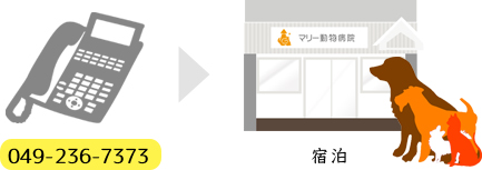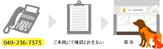 電話予約 ⇒ 来院(宿泊日の1週間前まで) ⇒ 宿泊